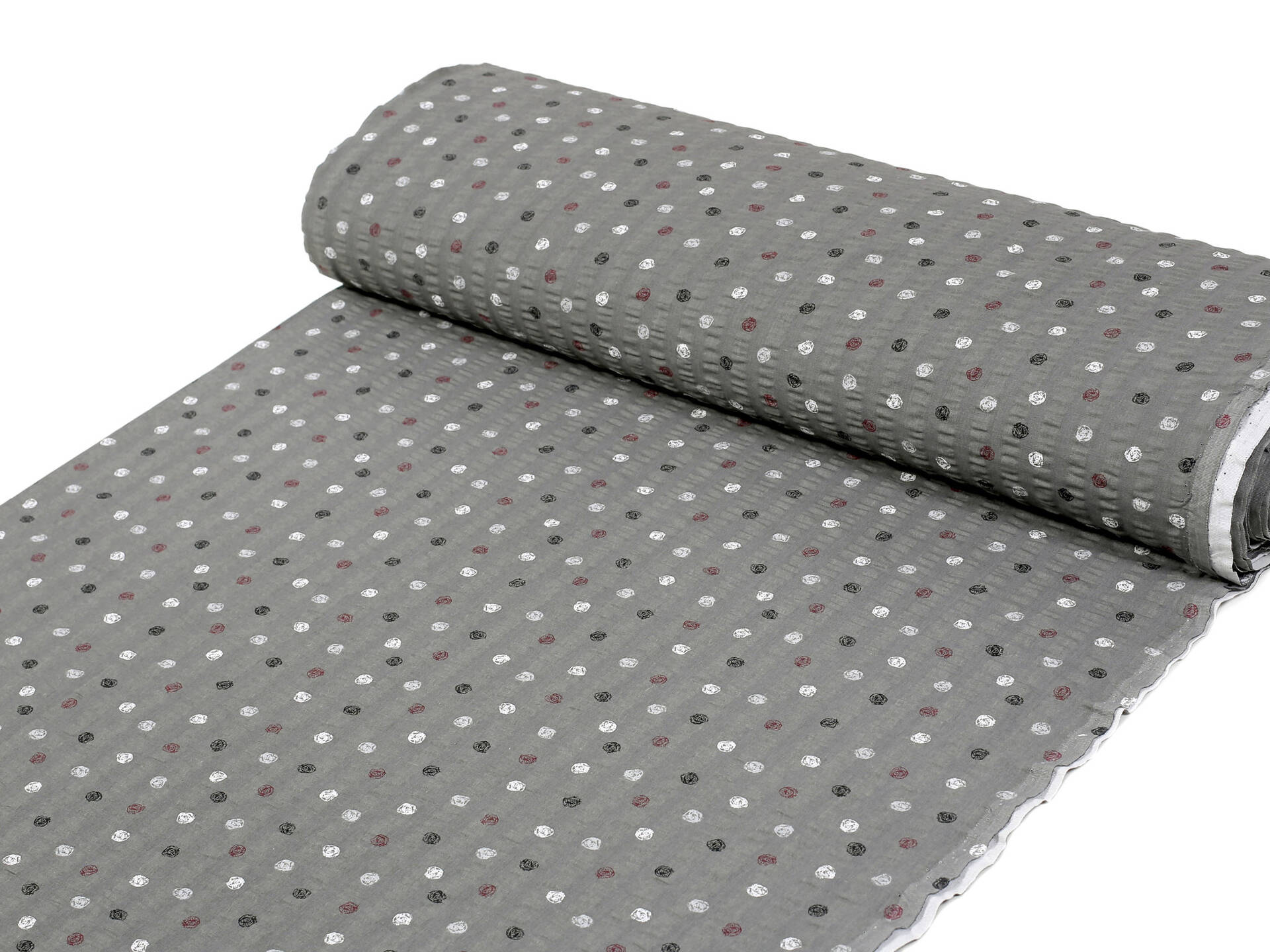 Unser Kreppstoff bunte Punkte auf Grau der Marke Škodák wird aus weicher 100% Baumwolle mit einem Gewicht von 145 g/m² und einer Breite von 145 cm hergestellt. Dieser Baumwollstoff wurde mit Oeko-Tex Standard 100 zertifiziert, was seine Gesundheitsunbedenklichkeit garantiert, und ist daher auch für Produkte für Kinder unter 3 Jahren geeignet.